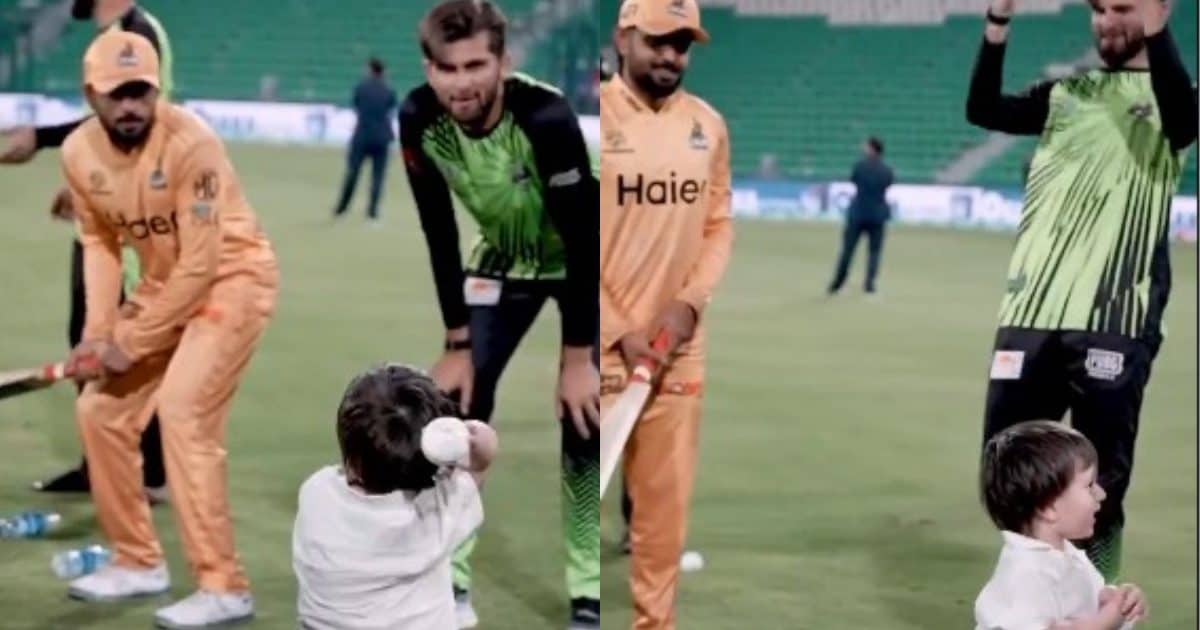 पीएसएल 11 के एक हाई-वोल्टेज मैच के बाद, जिसमें बाबर आजम की पेशावर जाल्मी और शाहीन अफरीदी की टीम आमने-सामने थीं, शाहीन अफरीदी का परिवार भी मैदान पर मौजूद था. आकर्षण का केंद्र बने शाहीन के नन्हे बेटे, अलियार अफरीदी. मैच खत्म होने के बाद जब खिलाड़ी एक-दूसरे से मिल रहे थे, तब बाबर आजम ने अलियार के साथ एक बेहद प्यारा और मजाकिया पल साझा किया. नन्हे अलियार ने अपने पिता के नक्शेकदम पर चलते हुए मैदान पर बाबर आजम को गेंदबाजी करने की कोशिश की. अलियार का गेंदबाजी एक्शन बिल्कुल अपने पिता शाहीन जैसा था, जिसे देखकर वहां मौजूद हर कोई मुस्कुरा उठा. लेकिन महफिल तो बाबर आजम ने लूटी. जैसे ही नन्हे अलियार ने गेंद फेंकी, बाबर ने मजाक में खुद को ‘LBW’ आउट घोषित कर दिया.