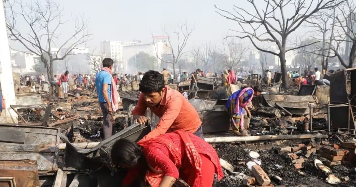 लखनऊ के टेडढ़ी पुलिया इलाके में भीषण आग लगने के बाद अपने सामान को ढूंढता परिवार.