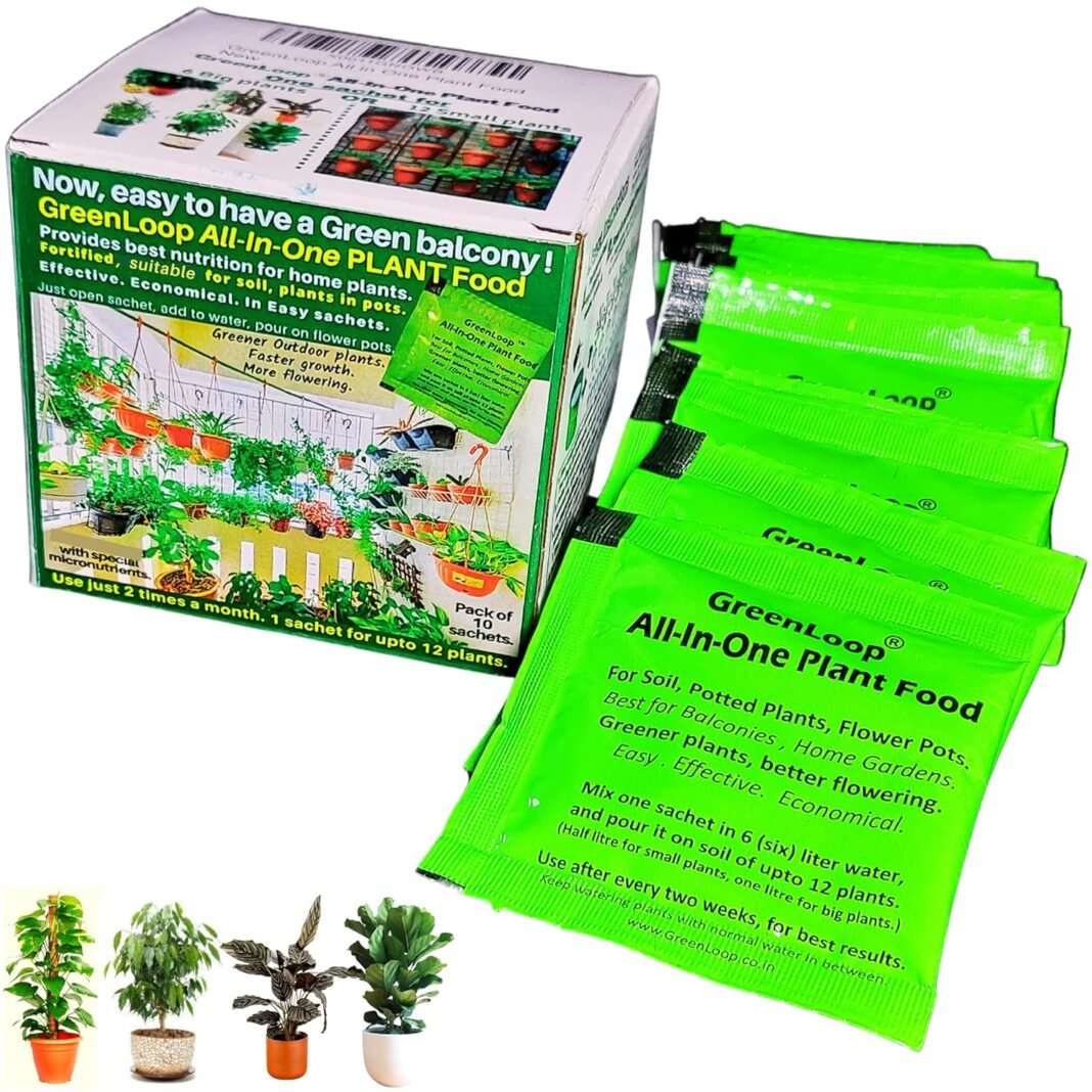GreenLoop All-In-One Plant Food has nutrition required by your plants. Improves plant health. Results are visible. Just use it twice a month. Just dissolve a sachet in water and pour that water on soil of upto 12 plants. That simple