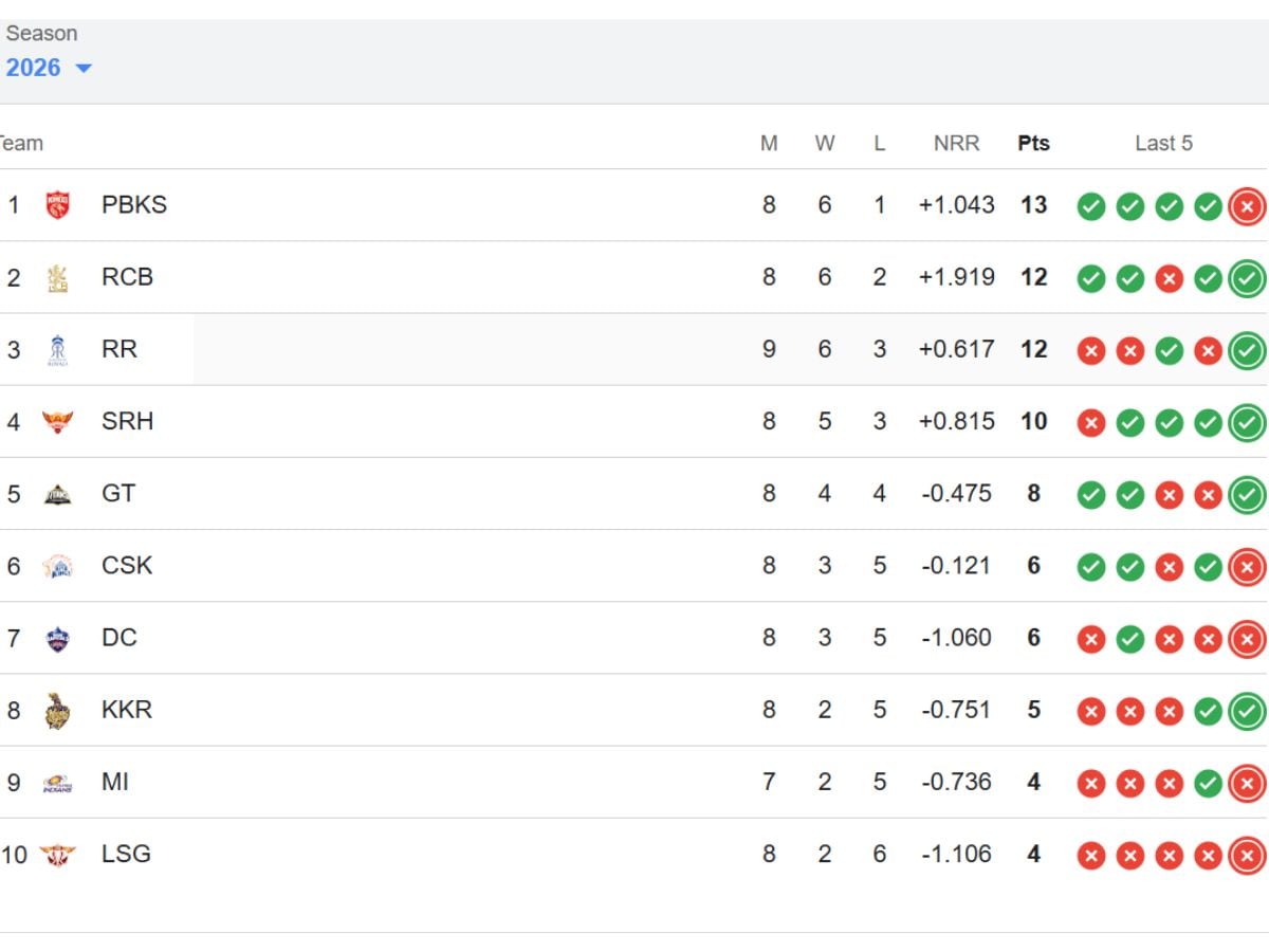 आईपीएल 2026 का कारवां अब अपने निर्णायक मोड़ पर पहुंच गया है. मंगलवार रात को राजस्थान रॉयल्स ने पंजाब किंग्स को उनके घर में हराकर न सिर्फ पंजाब की जीत का सिलसिला रोक दिया, बल्कि पॉइंट्स टेबल में भी हलचल मचा दी है. पॉइंट्स टेबल और लीग के आधे से ज्यादा सफर तय हो जाने के बाद, तीन टीमें ऐसी हैं जिनकी उम्मीदें अब ‘चमत्कार’ पर टिकी हैं.